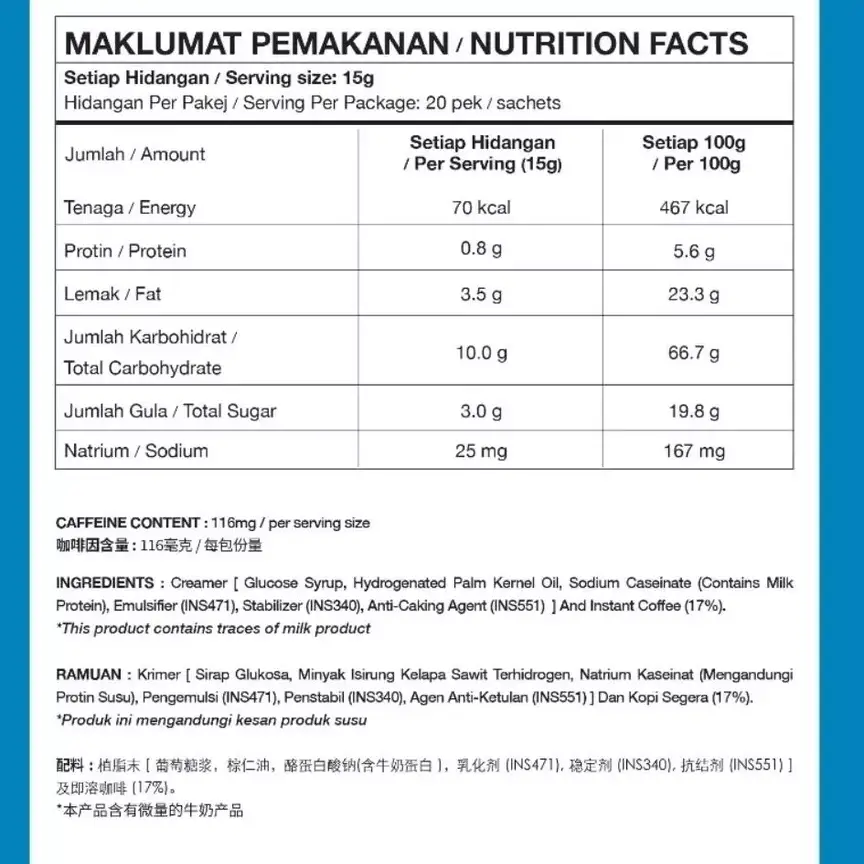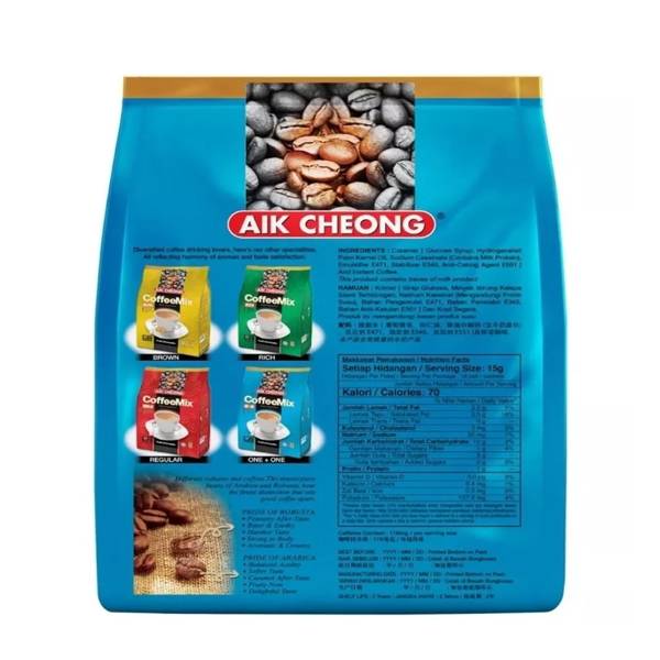 Aik Cheong One + One Coffee Mix (270g) is a popular Malaysian instant coffee blend, typically containing 18 individual sachets (15g each) of high-quality coffee with non-dairy creamer, but without sugar, offering a rich, smooth taste perfect for quick, everyday enjoyment by just adding hot water.