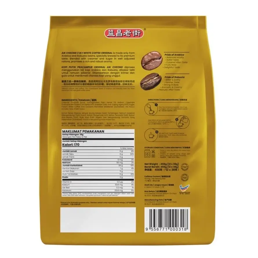 Aik Cheong White Coffee Original 456g is a popular Malaysian instant coffee mix containing 12 sachets (38g each) of 3-in-1 coffee, blending premium Arabica & Robusta beans with creamer and sugar for a rich, smooth, and aromatic drink, ready in moments by adding hot water, known for its authentic Malaysian taste and convenience.