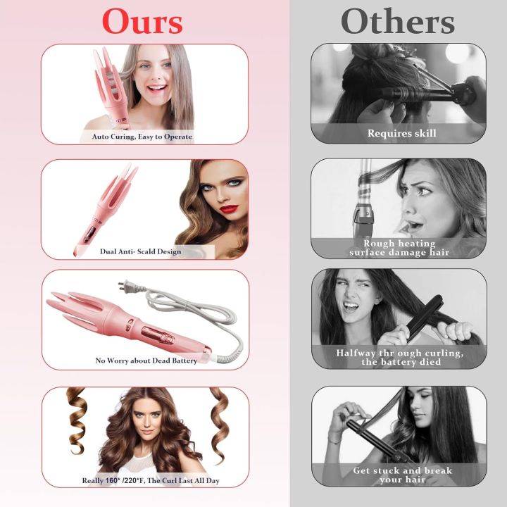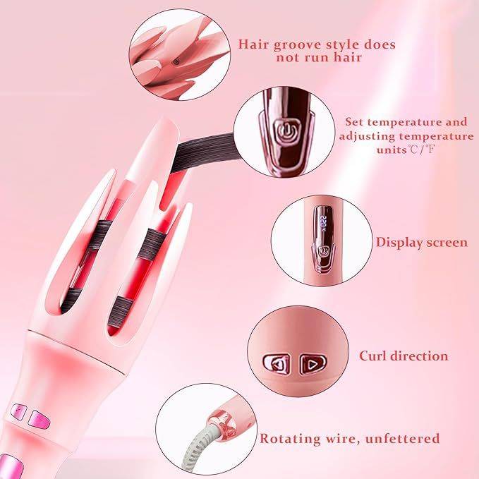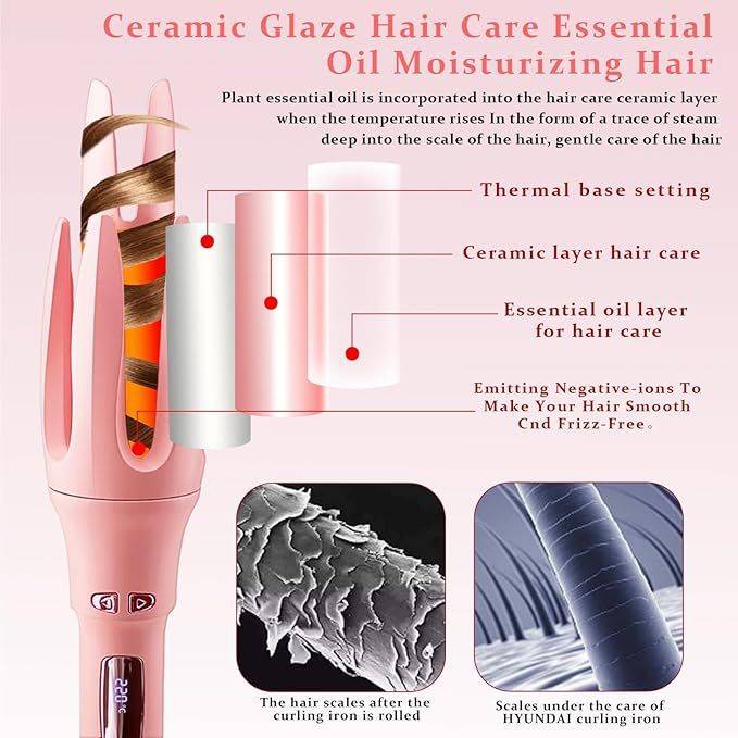 Essential oil ceramic layer and anion technology: Compared with traditional curling iron.Our rotating curling iron adds a double channel 25 million negative ion heating layer. Lock moisture in the hair and protect the cuticles. In addition, we have further innovated in the coating, adding a layer of plant hair care essential oil to the ceramic layer, which will enter the hair in the form of trace steam when the temperature rises, and provide more care for the hair.