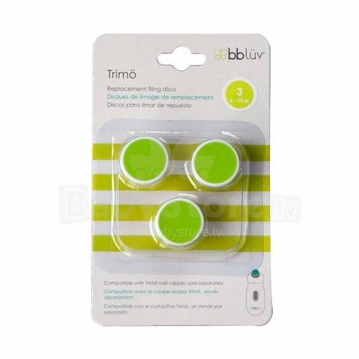 Replacement filing discs compatible with Trimö nail trimmer sold separately. Choose the appropriate color (stage) according to your baby’s age or nail thickness. Price is per pack of 3 discs.