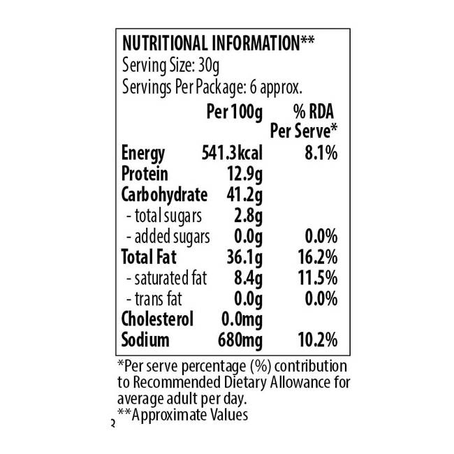 Nutrition: Energy 541.3 kcal, Protein 12.9g, Carbohydrate 41.2g, -total sugars 2.8g, -added sugars 0.0g, Total Fat 36.1g, - saturated fat 8.4g, -trans Fat 0.0g, Cholesterol 0.0mg, Sodium 680mg