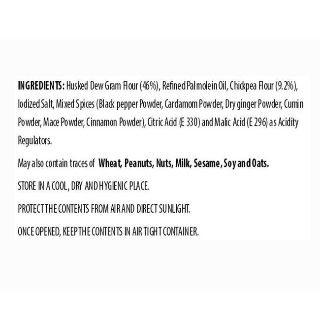 Tepary beans flour, Vegetable Oil, Chickpeas pulse flour, Red chili powder, black pepper powder, Ginger, Clove, Mace, Nutmeg & cardamom powders.