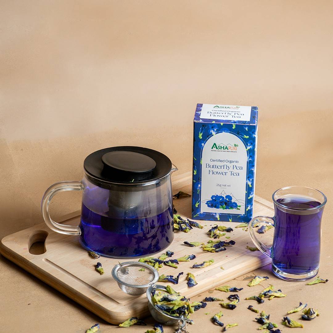 Butterfly Pea Flower tea is an herbal infusion made from the vibrant blue petals of the Clitoria ternatea plant. The butterfly pea plant is native to Asia and is renowned for its striking blue hue, which can transform into vibrant purple color when mixed with acidic substances. While low in calories, the tea is rich in vitamins and minerals such as vitamin C, vitamin E, and magnesium, making it power packed with numerous health benefits. Being naturally caffeine-free and a completely herbal concoction, blue tea is a powerhouse of antioxidant and culinary applications.