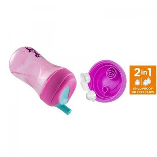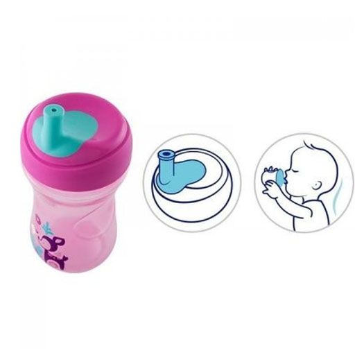 Easily removable flexible valve, a patent that makes the bowl 100% leak resistant to easily drink the infant with or without a valve. The shape of the orifice facilitates the correct positioning of the lips and promotes correct posture when drinking. Soft straw with a burglar-resistant training breech, which gradually helps to move to the normal straw. Ergonomic cup shape with a pit at the top to not bother the nose.