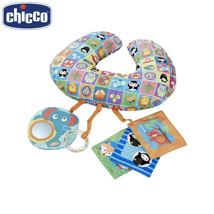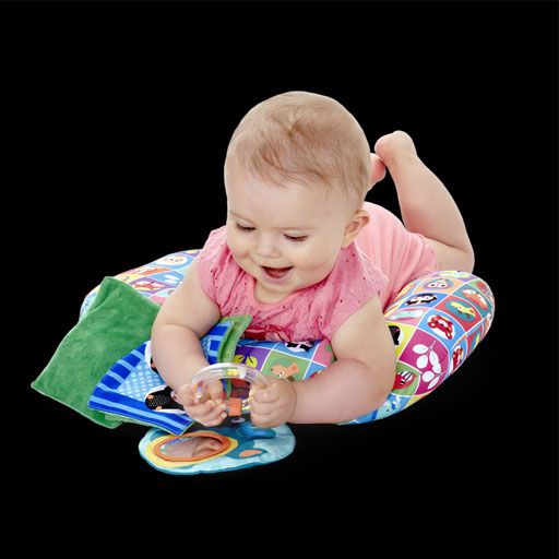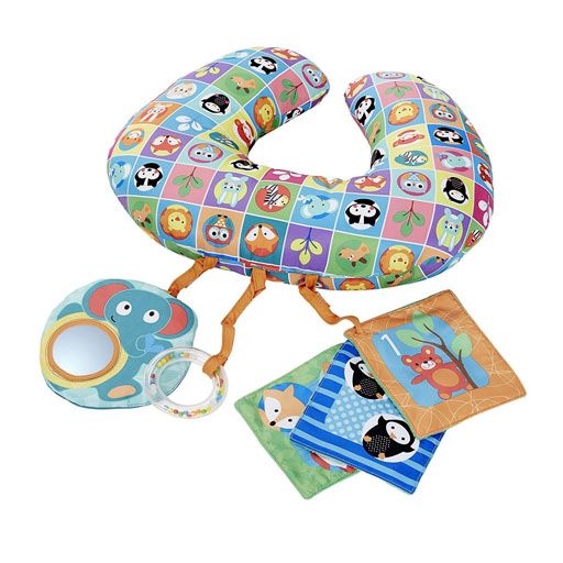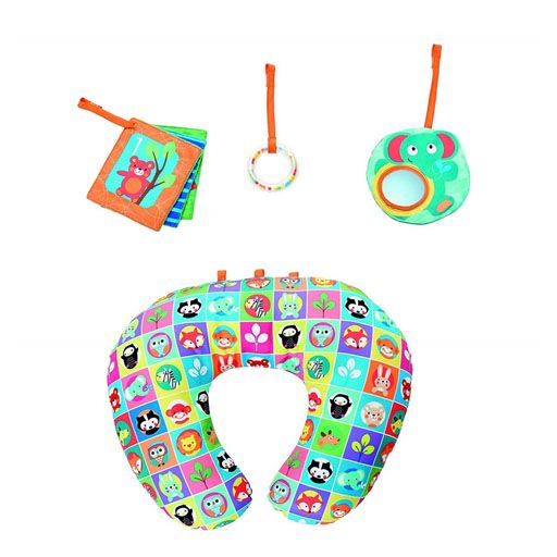 The ideal cushion to allow baby to lie down on the belly, safely, according to the recommendations of pediatricians. It allows to develop the tonicity and the muscular reinforcement of baby in the ventral position. With 3 removable hanging toys: a mirror, a book in fabric and a ring filled with colored balls that tinkle. Machine washable.