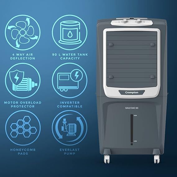 - Product: Crompton Gale DAC90 Desert Air Coolerwith water tank capacity (upto brim) of 90 L; Suitable for 470 sq. ft. room size