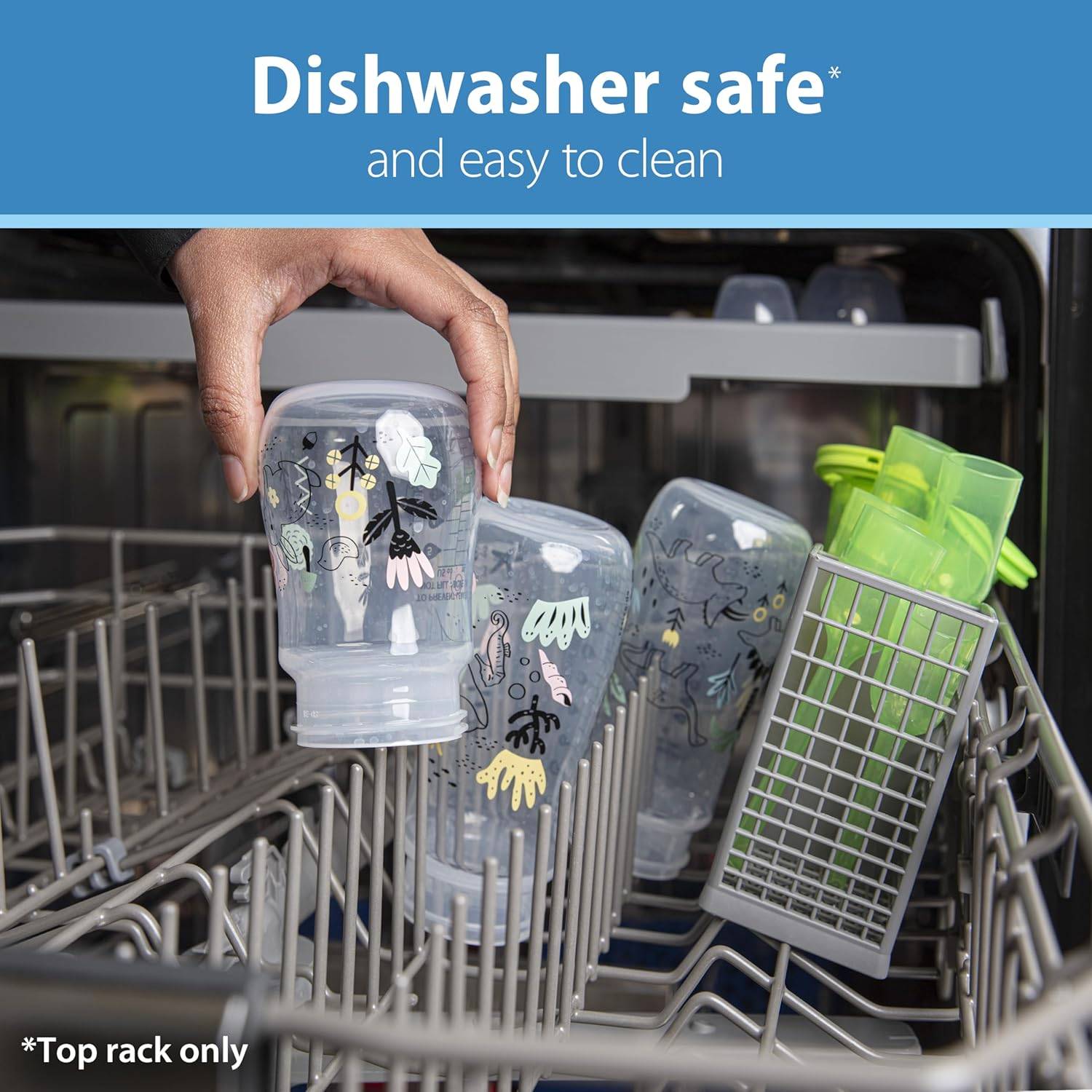 Safe for use in dishwasher (top rack only), electric and microwave sterilizers or boiling water