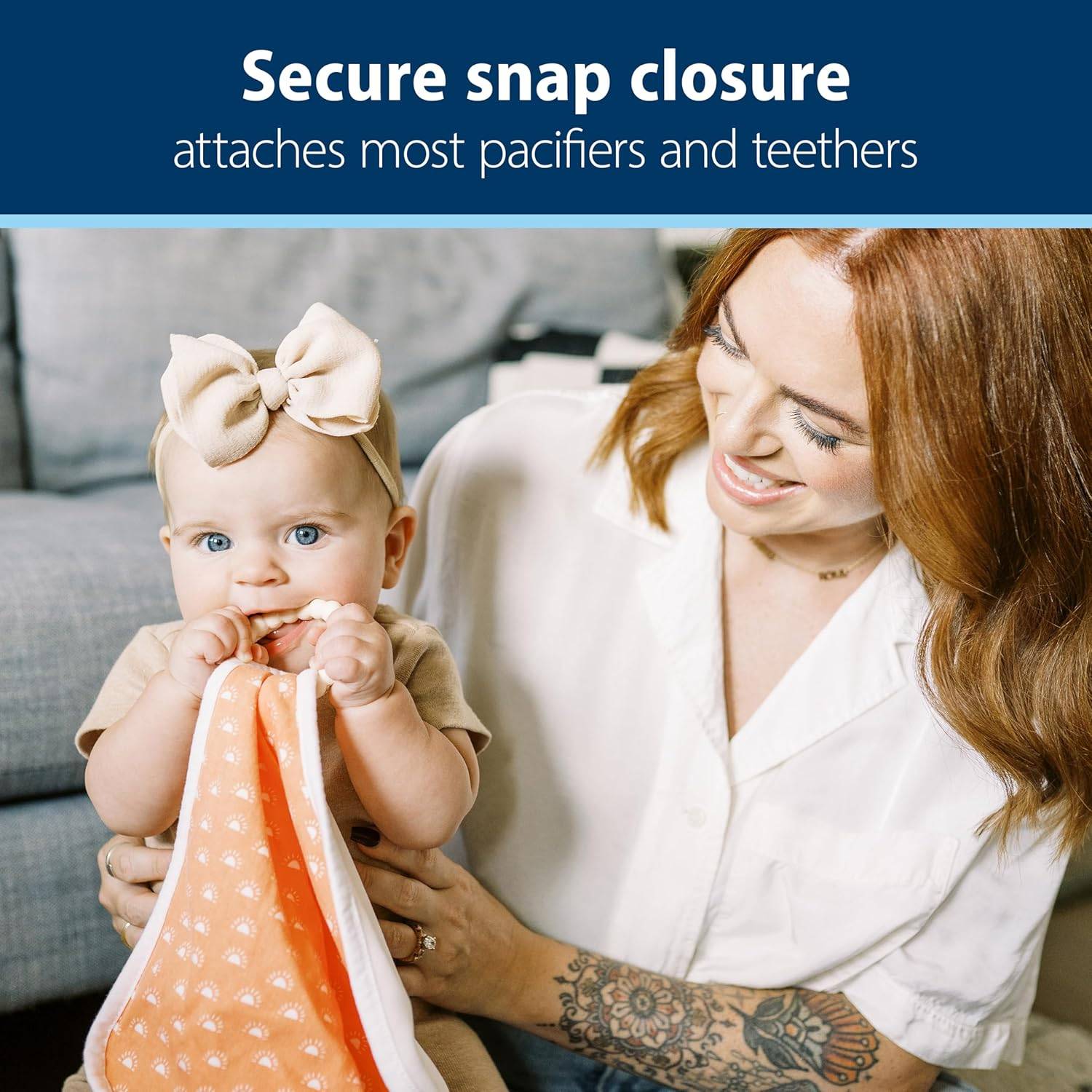 PACIFIER AND TEETHER HOLDER. Easy Snap closure keeps baby's pacifier or teether securely attached and easily accessible.