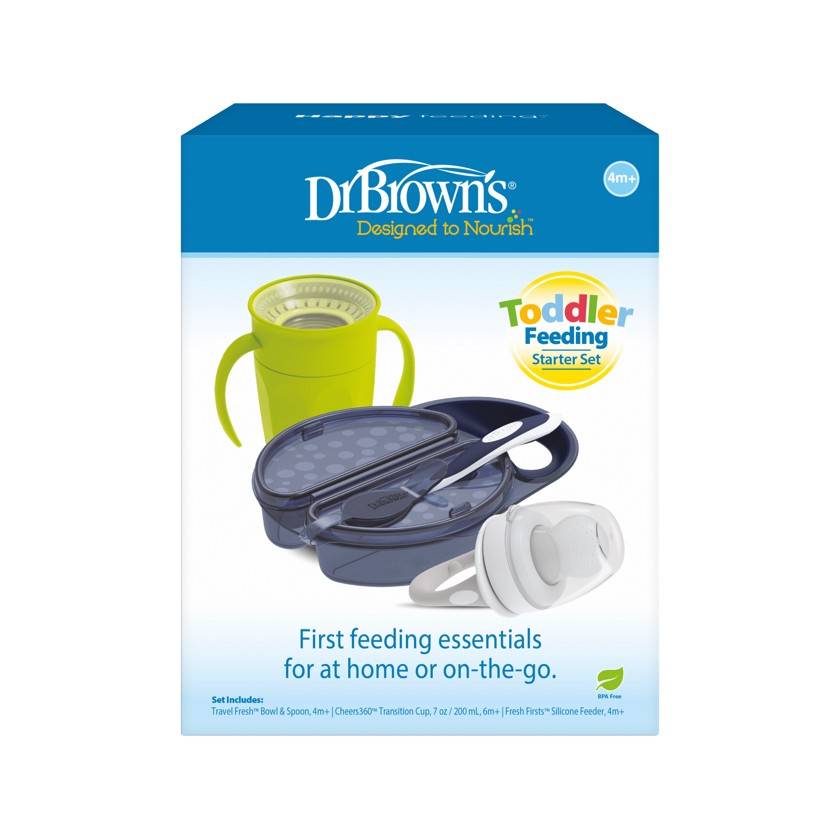 TODDLER FEEDING ESSENTIALS. Comes with 1 – Travel Fresh Bowl and Spoon 4m+, 1 – Cheers360 Spoutless Training Cup with Handles 6m+, 1 – Fresh Firsts Silicone Feeder 4m+