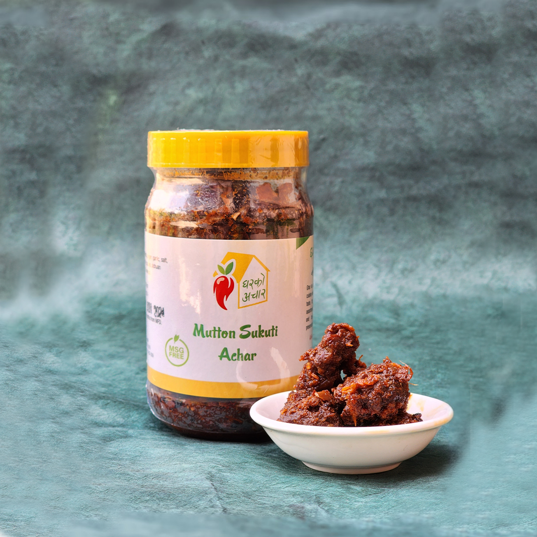 A bold and flavorful homemade delicacy straight from the heart of Nepali kitchens. Our Mutton Sukuti Achar is made from tender, sun-dried strips of mutton, slow-roasted and mixed with traditional spices, fresh garlic, ginger, fiery chilies, and a splash of tangy lemon or mustard oil for that authentic smoky zing. It’s spicy, smoky, and irresistibly nostalgic — just like mom used to make. Best served with a side of beaten rice or warm dal-bhat.
