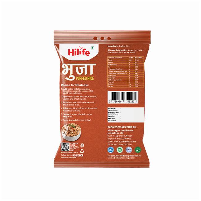 Hilife Bhuja brings you the true taste of Nepal in a fresh and crunchy form. Made from carefully selected rice, this light and wholesome snack delivers natural goodness in every bite. Hilife Bhuja is completely natural, gluten free and free from any artificial additives. It is the perfect everyday choice for people who enjoy clean and simple snacking. Enjoy it on its own, mix it with roasted peanuts and spices, pair it with tea or use it in your favorite traditional recipes. Its airy and satisfying crunch makes every snack moment enjoyable and refreshing.