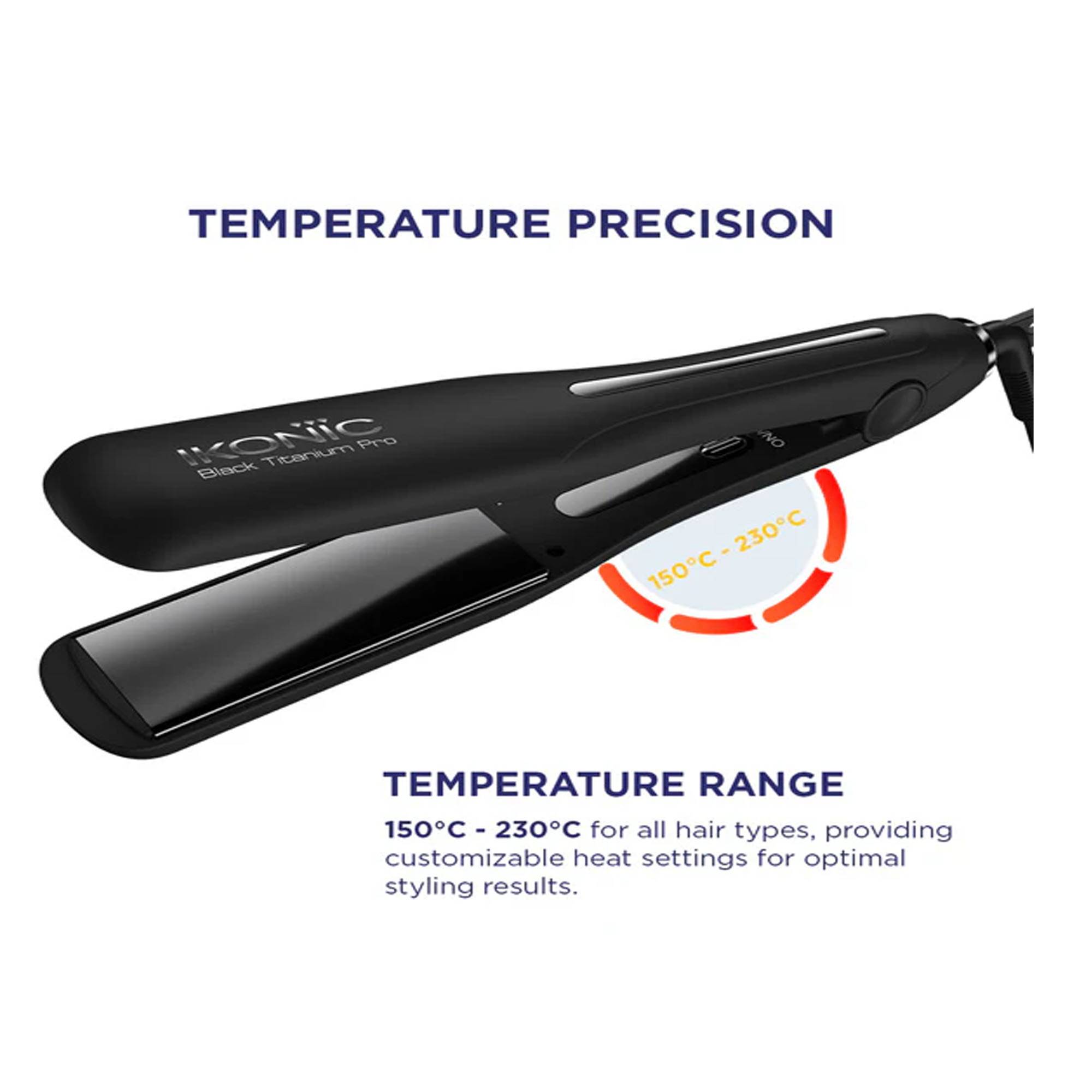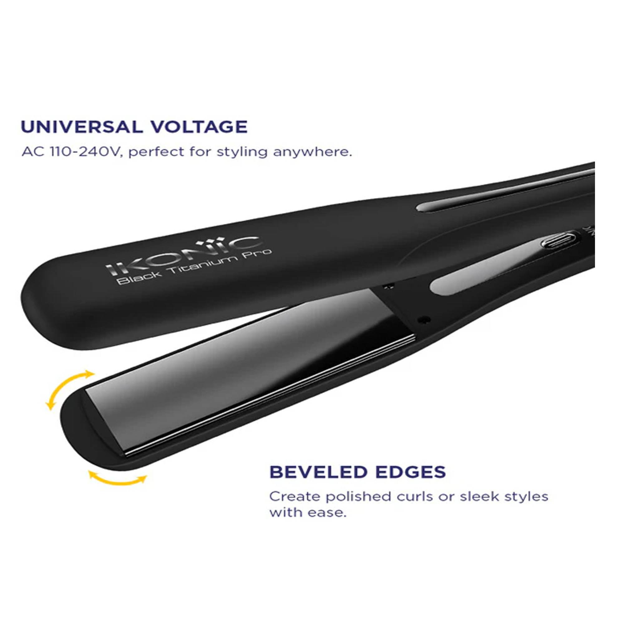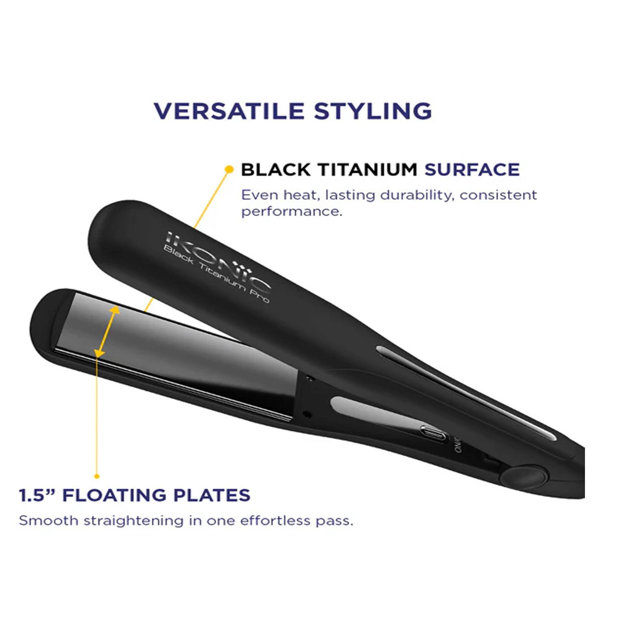 The Black Titanium Pro Hair Straightener is a high-performance styling tool engineered for precision and versatility. With its advanced black titanium plates, it provides even heat distribution for consistently smooth and shiny hair. The 1.5" wide floating plates allow for effortless straightening with just one pass, while the digital temperature control ensures optimal styling for all hair types. This straightener delivers long-lasting, polished results with ease.