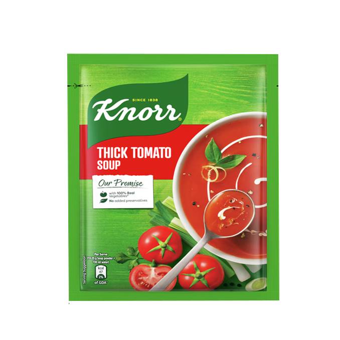 Classic Soup The classic tomato soup has gone desi with a dash of Indian spices. Thick and hearty, Knorr’s Classic Thick Tomato Soup pairs perfectly with a grilled cheese sandwich or freshly fried croutons. For a creamy texture, add ¼ cup of milk to your tomato soup.