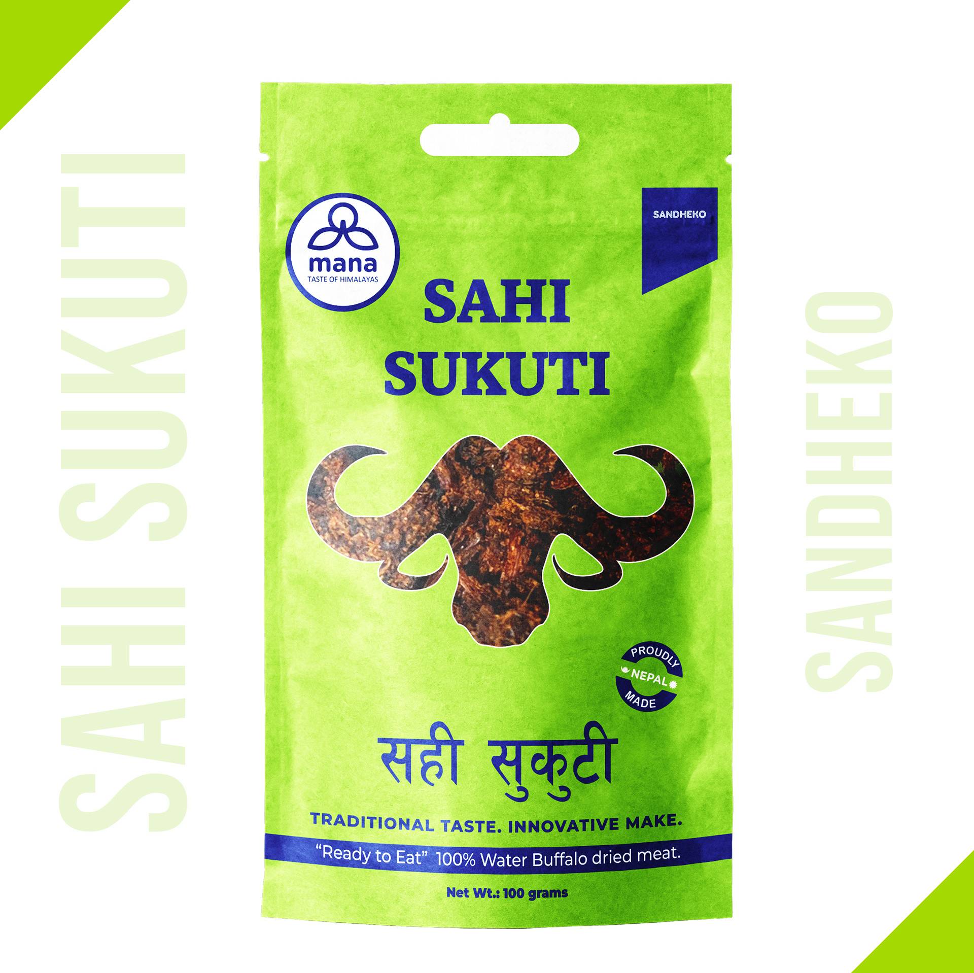 Sukuti is a traditional air-dried meat dish made from water buffalo meat. The ancient & traditional food can be made by marinating and charbroil along with the mixture of Himalayan spices & citrus. Sukuti is Famous Nepali savoury nibble to have with drinks. "Sahi Sukuti - Sandheko" is anytime, ready to eat snack from mana, which has essence of traditional food with innovative taste of Chat-Pate.