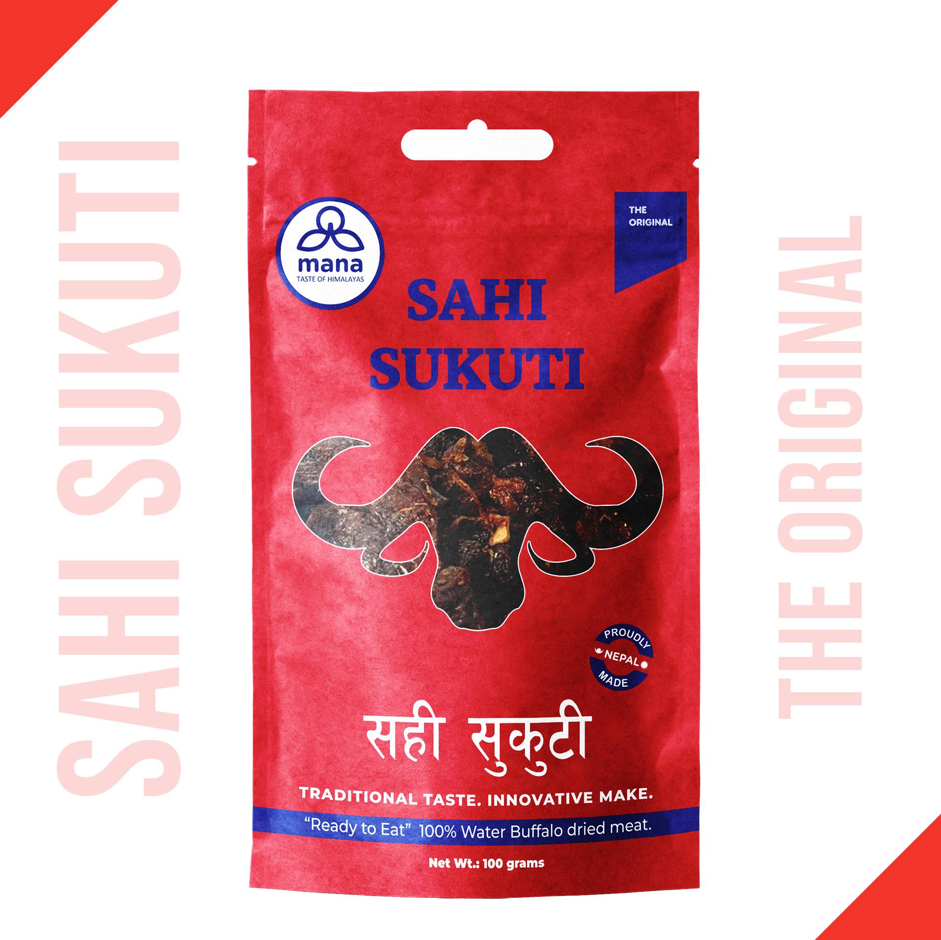 Sukuti is a traditional air-dried meat dish made from water buffalo meat. The ancient & traditional food can be made by marinating and charbroil along with the mixture of Himalayan spices & citrus. Sukuti is Famous Nepali savoury nibble to have with drinks. "Sahi Sukuti - The Original" is anytime, ready to eat snack from mana, which has essence of traditional food with innovative twist.