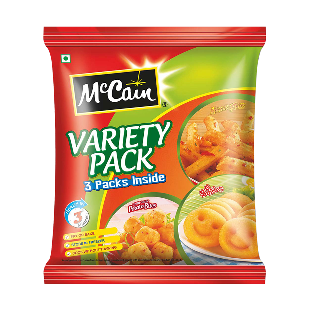 The McCain Variety Pack contains your favorite snacks: Chili Garlic Potato Bites, McCain Smiles, and Masala Fries. It’s the perfect pack for all your snack cravings.