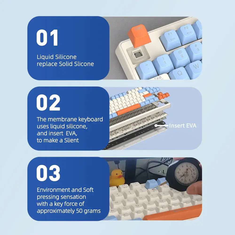 Newest Key-Cap Design with Slience: The membrane keyboard uses liquid silicone, and insert EVA, to make a slient environment and soft pressing sensation with a key force of approximately 50 grams.