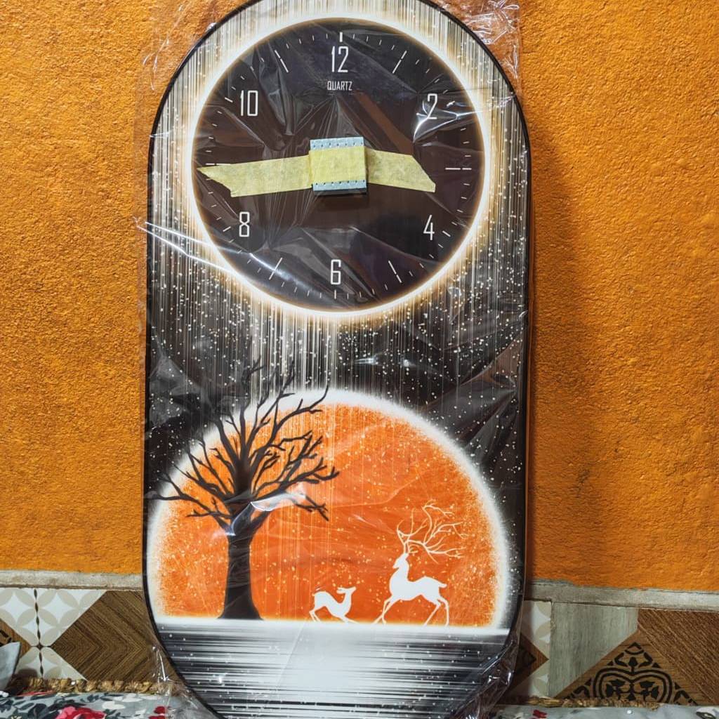 This modern oval decorative wall clock features a black background with gold waves and deer, offering a luxurious, artistic addition to contemporary homes