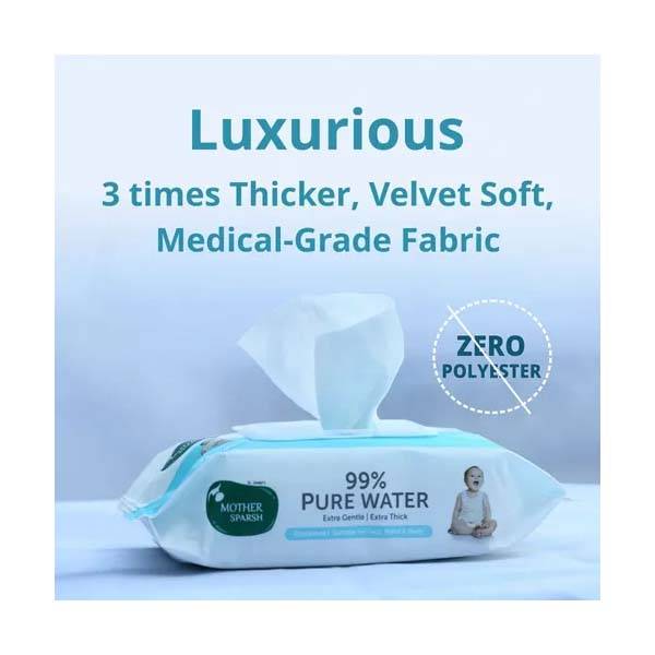 PLANT DERIVED FABRIC: Mother Sparsh 99% Pure Water Wipes are soft Plant-derived baby wipes made with medical-grade fabric & pure water that are soft on baby's delicate skin. They gently cleanse the baby's hands, face, or diaper area without harming their skin and decreasing the chance of skin rashes & irritation. WITH PLASTIC LID SEAL: Our pack of 99% Pure Water Baby Wipes comes with a plastic lid that keeps the wipes clean and wet. This lid ensures extra protection against germs, seals the wetness of the water wipes & prevents the wipes from drying out. DERMATOLOGICALLY TESTED: Our Pure Water Wet Wipes for babies are dermatologically tested and are suitable for the baby's delicate skin. They cleanse the dirt effectively without causing any skin rash or allergy on the baby's soft skin. FREE FROM HARMFUL CHEMICALS: Mother Sparsh Pure Water Wipes are thicker wet wipes free from typically used harmful chemicals used in polyester baby wipes like Alcohol, Paraben, Soap, SLS & SLES & ensure no harm to baby's delicate skin. ABSORBENT & UNSCENTED: 99% Pure Water Baby Wipes are unscented. They are free from artificial fragrances that may irritate your baby. The thick Plant-Derived fabric of the water baby wipes absorbs impurities, soothes the baby's skin, and keeps it moisturized. MOISTURIZATION: The presence of pure water in the wipes makes it an ideal choice for cleaning a baby's skin. Moisturizing properties of the water wipes keep hands, face & diaper area hydrated, prevent dryness and maintain pH balance, thus soothing & retain the freshness of the baby's delicate skin |
