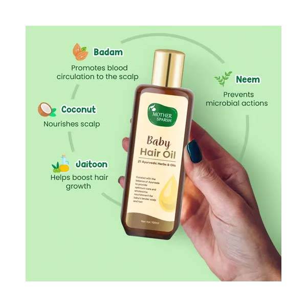 Brand:Mother Sparsh Scent:Almond, Tea Tree, Avocado, Argan OilItem Form:Oil Net Quantity:100.0 millilitre Number of Items:1 Use forWhole BodySkin Type:All Special Ingredients:Coconut, neem, sesame, groundnut, campahor, jaitun, badam, til, narikela, rosemarry, sarso, akhrot, devdaru, rice bran, sunflower, tea tree, lavender, jojoba oil, argan oil, Avocado Oil, Bergamot OilCoconut, neem, sesame, groundnut, campahor, jaitun, badam, til, narikela, rosemarry, sarso, akhrot, devdaru Material free:Paraben FreeItem Volume:100 Millilitres About this item -NOURISHING MOISTURIZATION FOR SCALP: Brimming with ayurvedic herbs, our Baby Hair Oil provides your baby with the much-needed daily dose of scalp hydration. The premium infusion of avocado oil in this oil forms a moisturizing layer over the baby's scalp and imparts nutrients essential for hair health. It works on the root shafts to nurture new hair follicles and strengthen baby hair strands. -IMPROVES BLOOD CIRCULATION: From time immemorial, head and hair massage has been practiced to improve blood circulation and healthy hair growth. Our Baby Hair Oil, with the rich infusion of Jaitun and other essential herbs, acts on the scalp to improve blood circulation. Massage the baby's scalp gently with your fingertips in a circular motion every day for the best result. -ANTI-FUNGAL & ANTI-INFLAMMATORY PROPERTIES: Our hair oil is rich with herbs and oils known for their antimicrobial and anti-inflammatory properties. Essential oils such as Tea Tree Oil, Jojoba Oil, and Argan Oil and herbs such as neem and Jaitun help keep microbial infection at bay. The soothing nature of these oils nourishes your baby’s scalp and helps to promote scalp health. -LIGHTWEIGHT & NON-STICKY: We took special care in bringing you a lightweight & non-sticky baby hair oil. The smooth texture of the oil provides the baby’s scalp and hair with the necessary oil balance without making it sticky or smelly. The oil is bottled with a natural fragrance of essential oils and herbs, giving your baby’s head a soothing smell. -IDEAL FOR ALL SKIN TYPES: This Baby Hair Oil is devoid of harmful chemicals such as SLS, Parabens or mineral oils. We have also kept a check on the fragrance that goes into the product to ensure allergy-free moisturization for baby scalp. It is safe for all skin and hair types. |