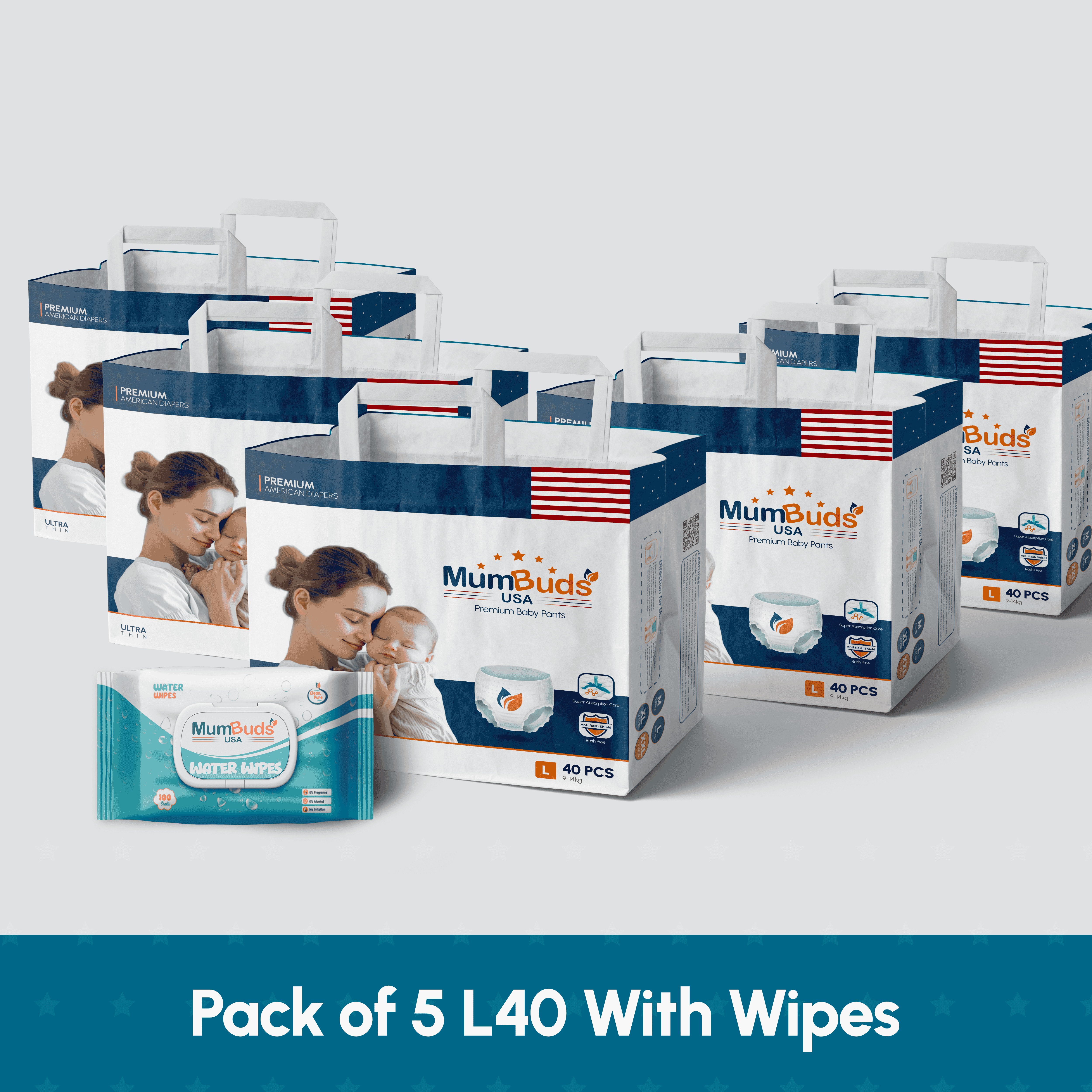 MumBuds American UltraThin Baby Diaper Large 40Pcs Pack of 5 With Wipes