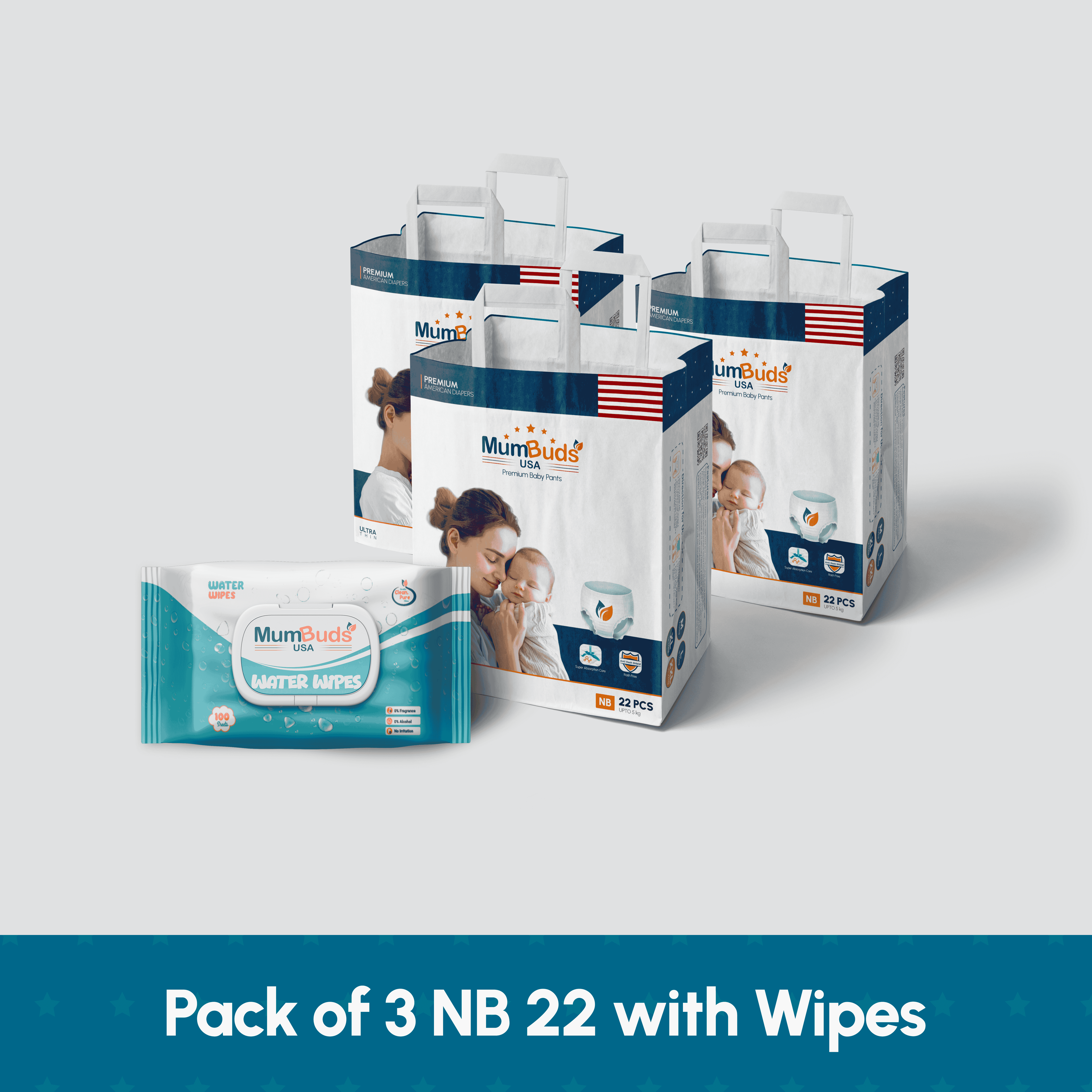 MumBuds American UltraThin Baby Diaper Newborn 22Pcs Pack of 3 With Wipes