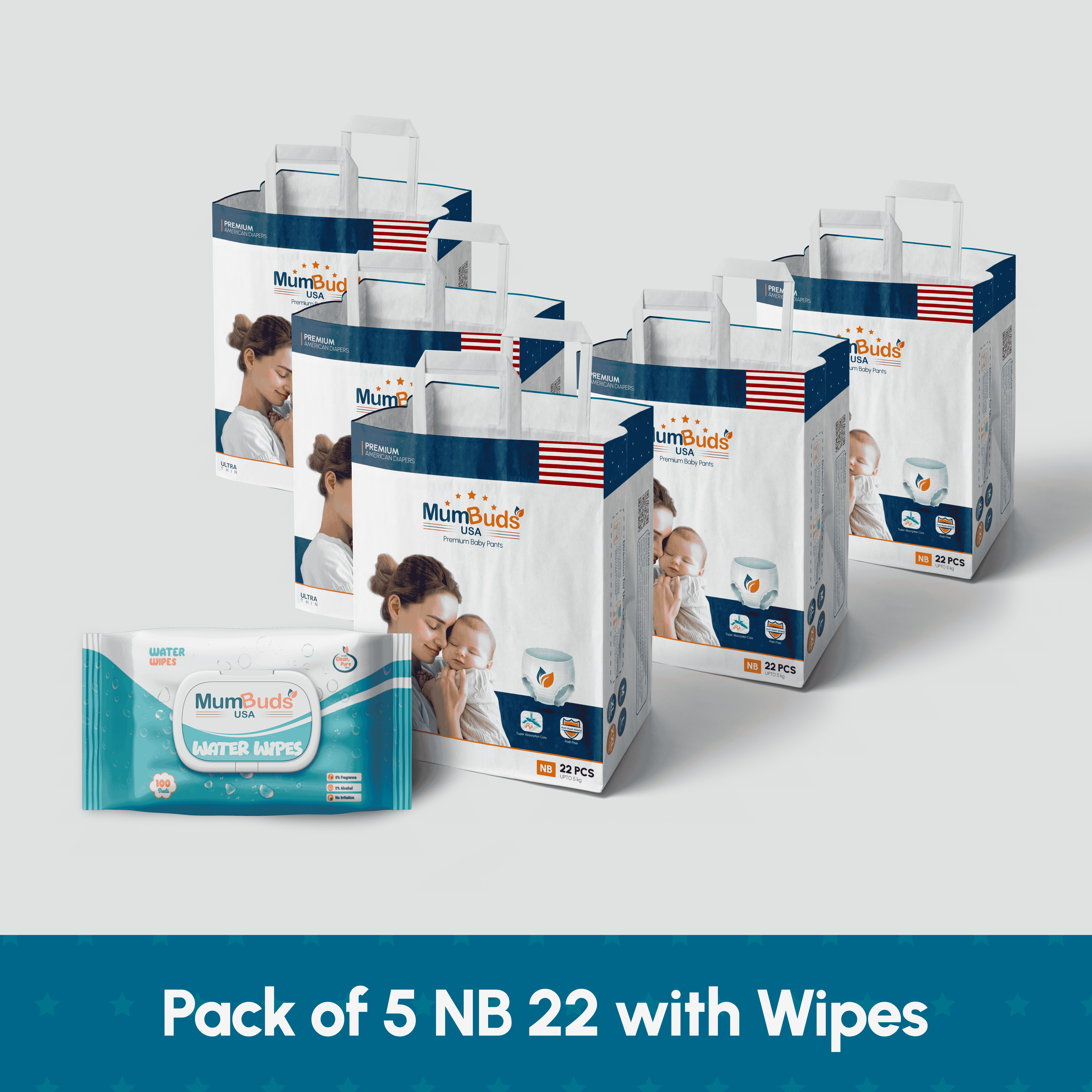 MumBuds American UltraThin Baby Diaper Newborn 22Pcs Pack of 5 With Wipes