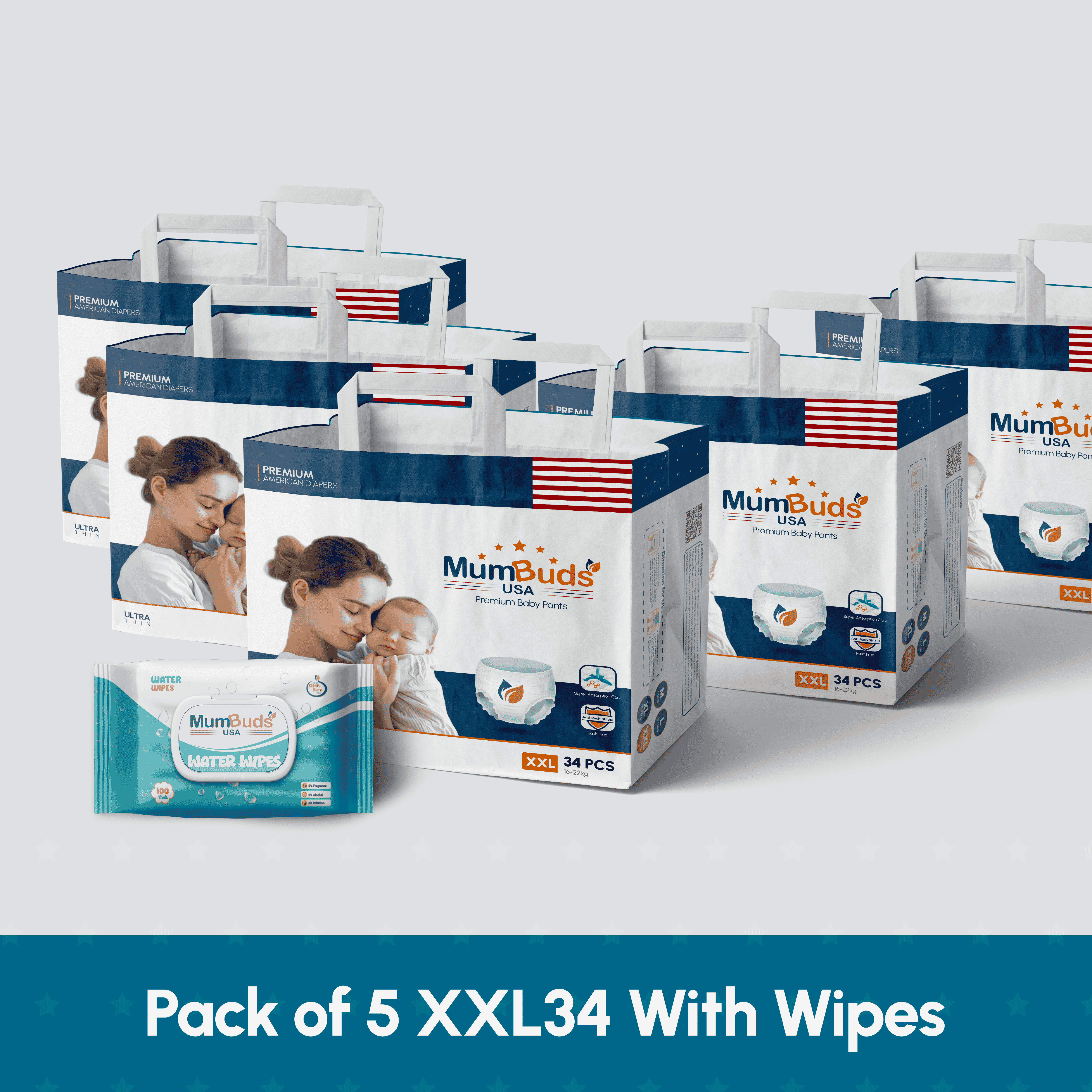 MumBuds American UltraThin Baby Diaper XXL 34Pcs Pack of 5 With Wipes
