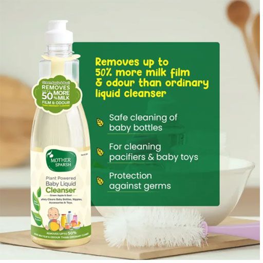 POWERED BY PLANTS- A baby's immune system is sensitive and prone to infections from external factors & may be from the chemicals used in different baby products. Mother Sparsh Plant-Powered Bottle Liquid Cleanser is made with a blend of botanical extracts and plant-derived ingredients like Basil & Green Apple that have a mild cleansing action on baby bottles which is safe for baby's health.