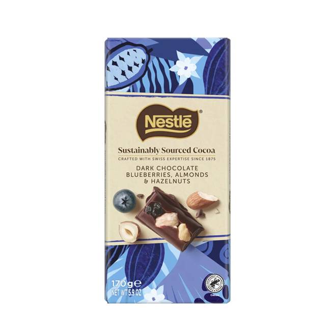 Experience the sensational taste of NESTLE Sustainably Sourced Cocoa Milk Chocolate, Blueberries, Almonds & Hazelnuts. A deliciously indulgent milk chocolate tablet crafted with visible inclusions of blueberries, almonds and hazelnuts. At the heart of our creamy, smooth chocolate is sustainably sourced cocoa, so you can enjoy chocolate that does good* and tastes great. It's the perfect gift for taking home to chocolate connoisseurs, or for treating yourself on your journey.