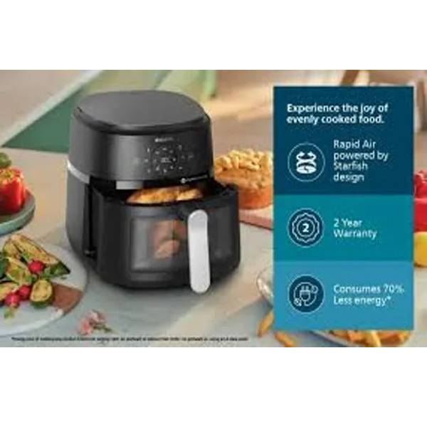 Patented Rapid Air technology with unique starfish design pan ensures evenly fried results without flipping the food