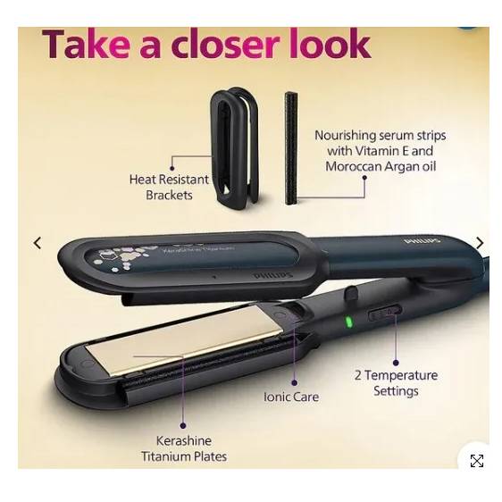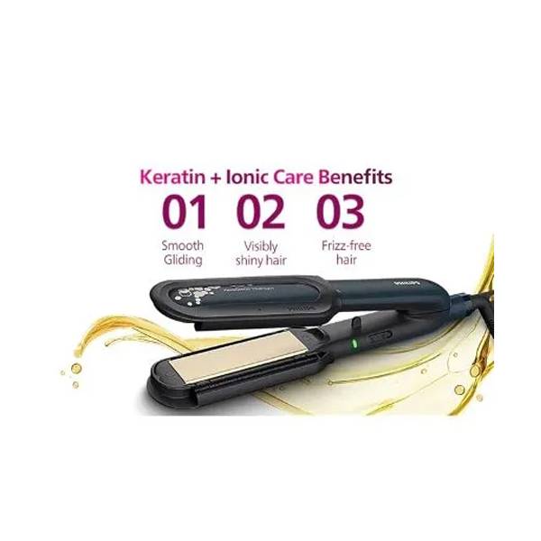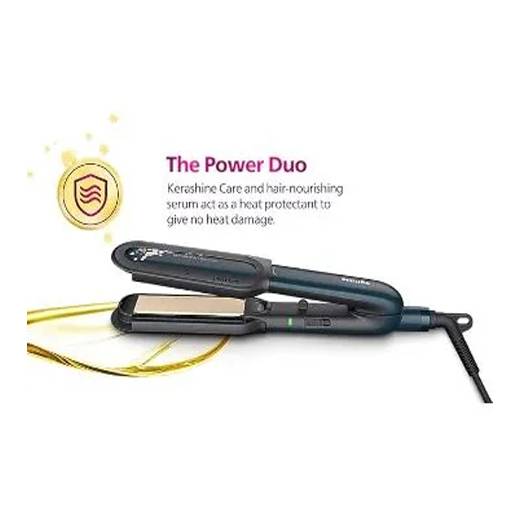 NourishCare Technology Transform your hair effortlessly while keeping it healthy with the PHILIPS hair straightener. Moisture lock NourishCare technology forms a protective layer on your hair, preventing water loss caused by heat, ensuring your hair remains hydrated and healthy. Say goodbye to dryness and breakage, and hello to smooth, nourished locks that shine with vitality. KerashineCare for Styling with Heat Protection The Power Duo Kerashine care and hair nourishment serum acts as a heat protectant, preventing heat damage while providing smooth gliding, visibly shiny, and frizz-free hair. With each pass of the PHILIPS hair straightener, your hair receives a dose of nourishment, leaving it stronger and more resilient. Kerashine Titanium Plates The 29 x 90 mm Kerashine Titanium plates offer fast heat transfer and shine, along with Ionic care nourishment, leaving your hair smooth and shiny. The wider plates cover more hair in each pass, reducing styling time and minimizing exposure to heat, resulting in healthier-looking hair. SilkProtect Technology Ensures optimized temperature to minimize heat exposure, leaving your hair silky-smooth and healthy-looking. With SilkProtect Technology, you can style your hair with confidence, knowing that it's protected from excessive heat, breakage, and damage. Temperature Settings Adjustable temperature settings range from 190°C to 210°C, allowing you to customize the heat according to your hair type and styling needs. Whether you have fine, delicate hair or thick, coarse locks, you can find the perfect temperature setting for optimal results. Heat Up Time Quick heat-up time of 60 seconds, allowing you to start styling your hair without any delay. With its rapid heating technology, this straightener saves you time and energy, so you can achieve your desired hairstyle in no time. Fragrance-Free Serum The included serum strips with Vitamin E and Moroccan organ oil are fragrance-free, providing nourishment to your hair without any overpowering scent. Enjoy the benefits of silky-smooth, glossy hair without the hassle of strong fragrances. Cord Length and Swivel The PHILIPS hair straightener comes with a 1.6-meter cord with a swivel feature for ease of use and flexibility during styling sessions. Whether you're styling your hair at home or on the go, the long cord and swivel design ensure maximum convenience and comfort.
