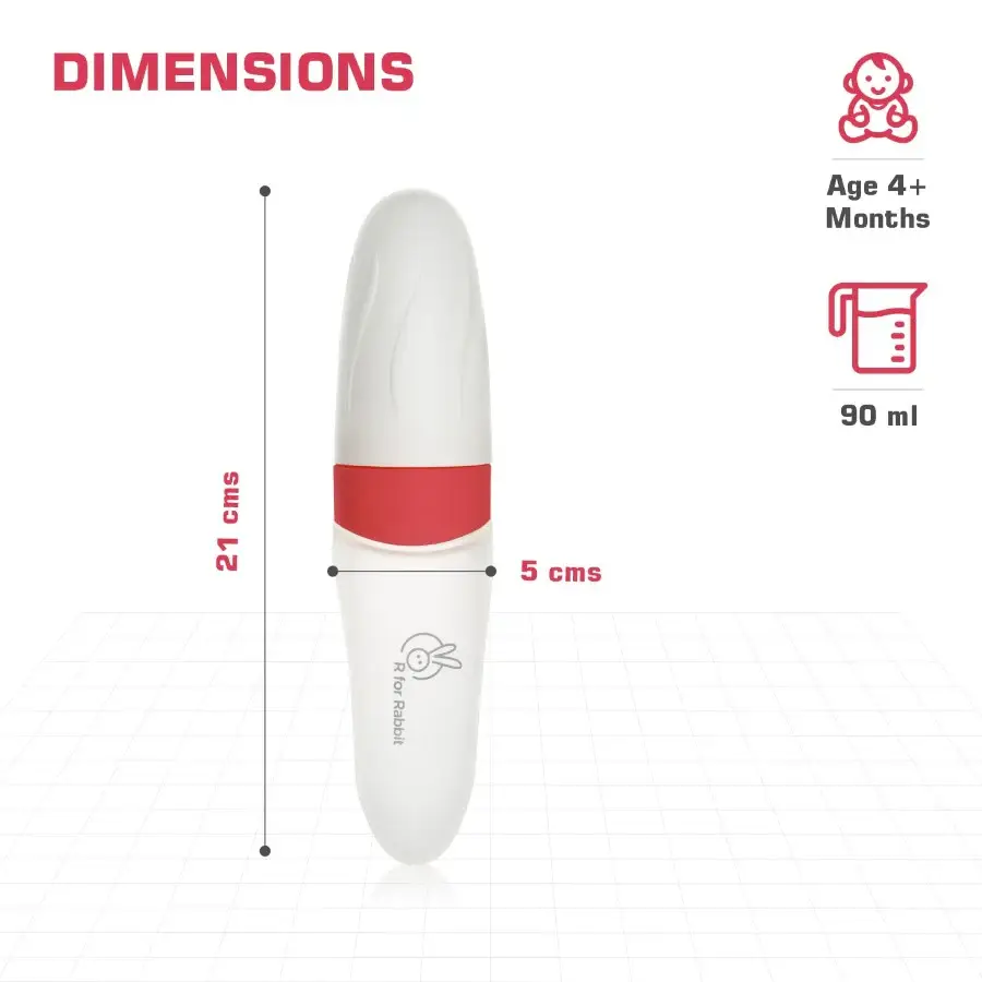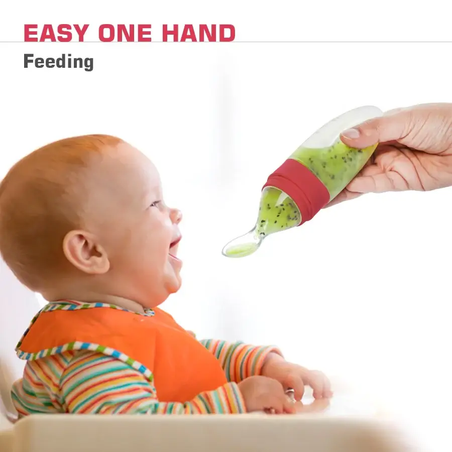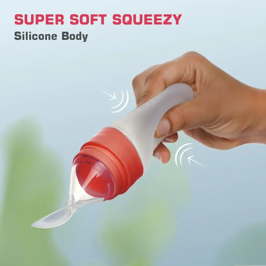 Easy To Use: First Feed Feeder can be used by simply holding it with one hand and pressing the soft silicone container to bring food on the spoon and feed the baby.