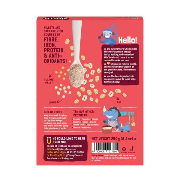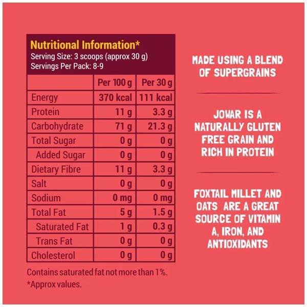 Cooks in 3-5 minutes in water/milk. Add natural sweetener to taste Made using a blend of supergrains Zero maida, sugar, salt, trans fat, preservatives, artificial colours or flavours 100% vegetarian Best before 12 months from the date of packaging Awesomeness Inside: Jowar - naturally gluten-free grain and rich in proteinFoxtail millet - a great source of vitamin A, iron, and magnesium Oats - rich source of fibre, vitamins, minerals, and antioxidants |