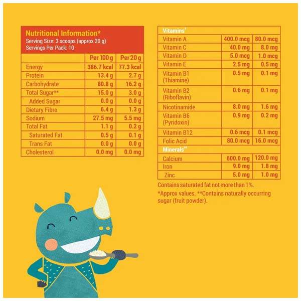 Instant cereal mix: just add water / milk, mix, and serve Made using natural mango powder, powdered rice, and supergrains Sweetened with premium Arabian date powder Zero maida, sugar, salt, trans fat, preservatives, artificial colours or flavours 100% vegetarian Best before 12 months from the date of packaging Awesomeness Inside: Fortified with 13 essential vitamins and mineralsRagi - 10X the calcium of wheat and riceJowar - naturally gluten free grain and protein rich |