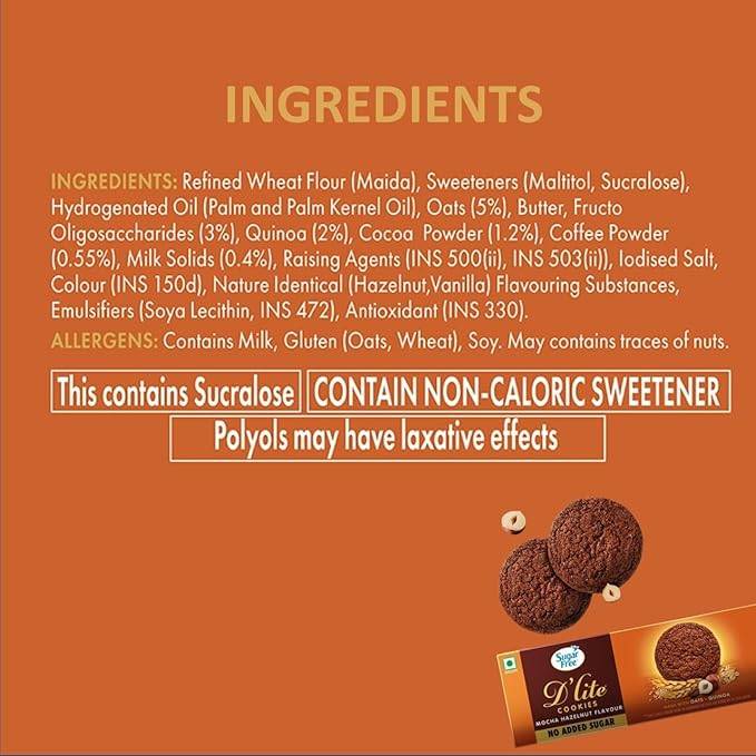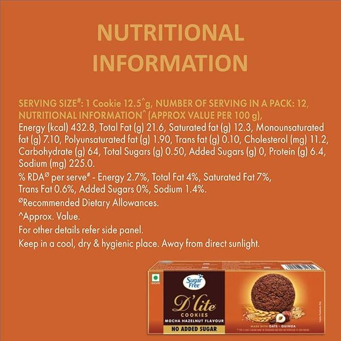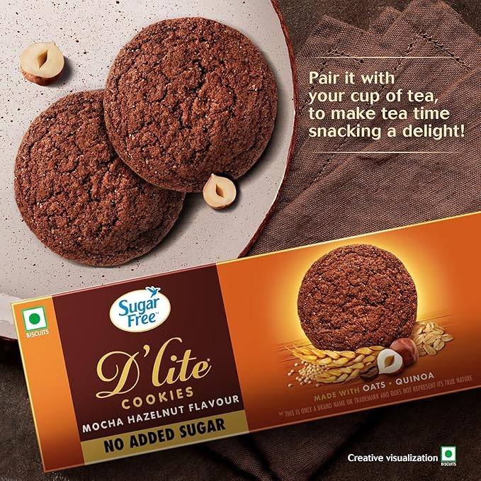 No Sugar, Just Sweetness: Sugar Free D’Lite Cookies contain absolutely Zero Added Sugar, unlike most Premium Cookies that come loaded with sugar which gives them their characteristic sweet taste. This makes them a great choice of snack for Health Conscious people who are mindful about their indulgences.