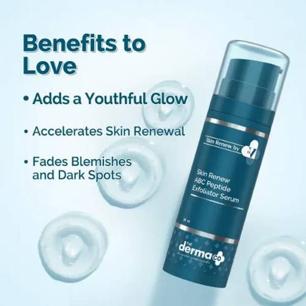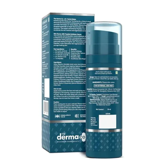 Introducing Skin Renew by The Derma Co., a first of its kind skincare line, envisioned in collaboration with leading cosmetic formulator, Dr. Vanita Rattan. Powered by Peptides, the skincare line addresses distinct Indian skin concerns and accelerates skin renewal. Leading the charge is our all-round superstar serum that fights dullness, fades blemishes, and improves skin elasticity and radiance. Presenting the Skin Renew ABC Peptide Exfoliator Serum - the solver of skin concerns, the giver of youthful skin. Formulated with brightening and acne-fighting actives like Lactic Acid (A), Salicylic Acid (B), and Vitamin C (C), this wash-off serum works hard to fade blemishes, improve skin texture and remove dullness. The ABC of healthy, youthful and glowing skin truly begins here. Lactic Acid and Salicylic Acid are exfoliants that slough off dead skin cells as they unclog pores. While Vitamin C, a powerhouse of antioxidants, brightens your skin, leaving it radiant. And we saved the best for the last! Peptides - the superhero ingredient that stimulates skin regeneration and boosts skin elasticity.