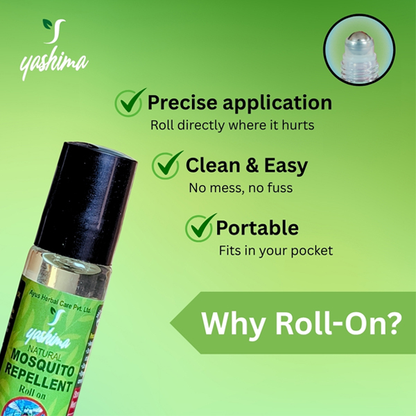 Yashima Mosquito Repellent Roll-On (10ml) is a herbal insect repellent made by Ayus Herbal Care Pvt. Ltd., offering natural, non-toxic protection against mosquitoes and insect bites. Its